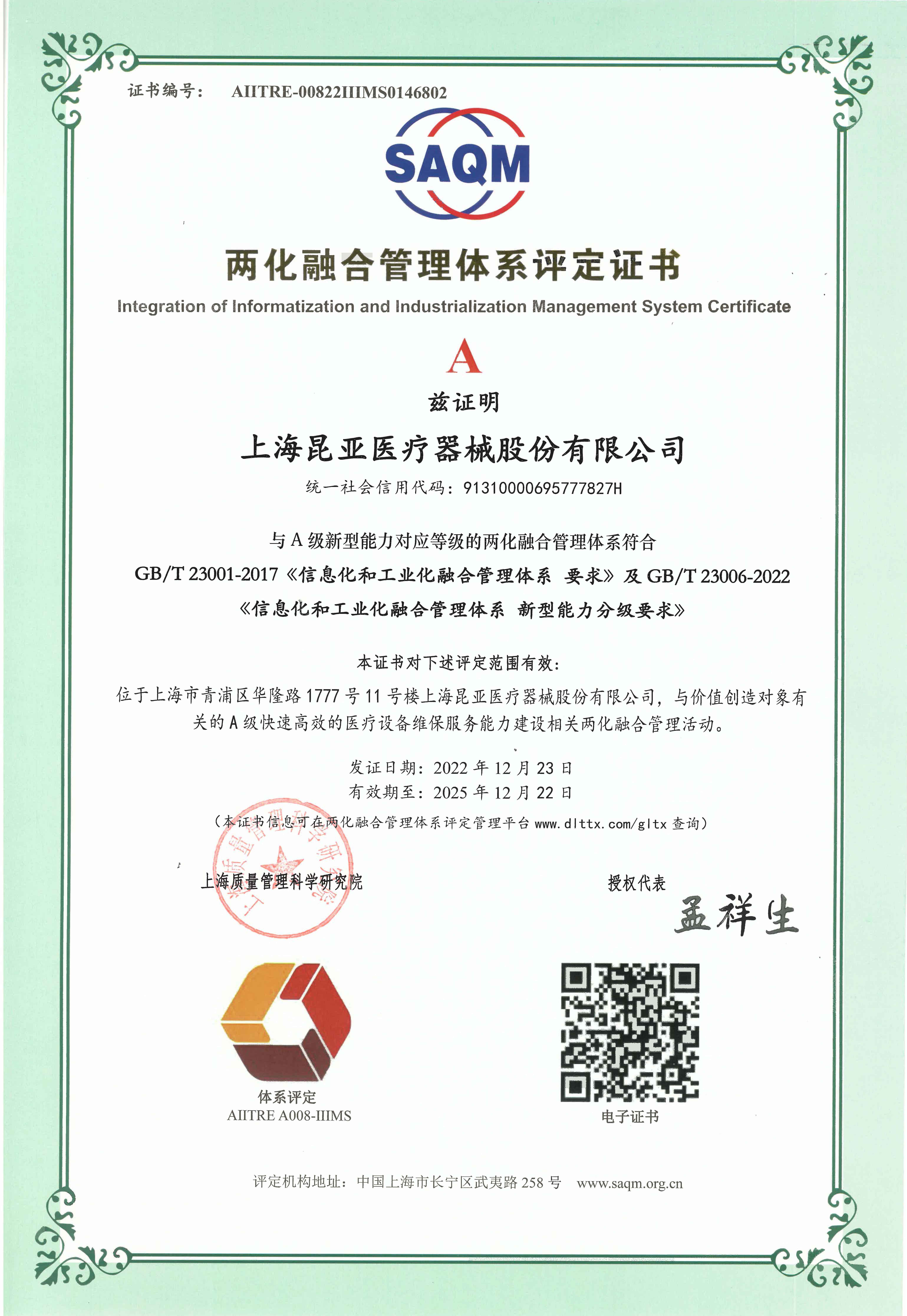 上海昆亞醫(yī)療器械股份有限公司是一家醫(yī)療設(shè)備服務(wù)平臺(tái)提供商,公司主營(yíng)業(yè)務(wù)為醫(yī)院醫(yī)療設(shè)備整體提供維保外包服務(wù),致力于全院醫(yī)療設(shè)備預(yù)防性全生命周期管理;以全面提升醫(yī)院醫(yī)療設(shè)備管理水平、臨床醫(yī)療設(shè)備使用率和開(kāi)機(jī)率打造的專(zhuān)業(yè)化醫(yī)療設(shè)備服務(wù)平臺(tái)。 昆亞醫(yī)療,已通過(guò)ISO14001環(huán)境管理體系、ISO45001職業(yè)健康與安全管理體系、ISO9001質(zhì)量管理體系、ISO13485醫(yī)療器械質(zhì)量管理體系、ISO27001信息安全管理體系五大國(guó)際認(rèn)證;同時(shí),昆亞醫(yī)療為合作客戶(hù)提供設(shè)備服務(wù)保險(xiǎn);2017年,昆亞醫(yī)療榮獲得上海市高新技術(shù)企業(yè)稱(chēng)號(hào),并獲得上海市經(jīng)信委工業(yè)互聯(lián)網(wǎng)創(chuàng)新發(fā)展專(zhuān)項(xiàng)資金支持;2019年,昆亞醫(yī)療榮獲兩化融合管理體系評(píng)定證書(shū);2021 年,榮獲“張江之星”企業(yè)稱(chēng)號(hào)、榮獲中國(guó)設(shè)備管理協(xié)會(huì)醫(yī)療行業(yè)分會(huì)廣東省培訓(xùn)基地,通過(guò)企業(yè)標(biāo)準(zhǔn)管理體系認(rèn)證、企業(yè)誠(chéng)信管理體系認(rèn)證;2022 年,昆亞醫(yī)療榮獲上海市“專(zhuān)精特新”企業(yè)稱(chēng)號(hào),通合規(guī)管理體系認(rèn)證、反賄賂管理體系認(rèn)證。。